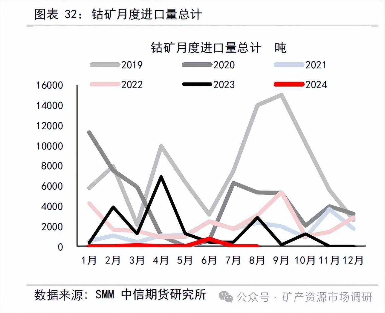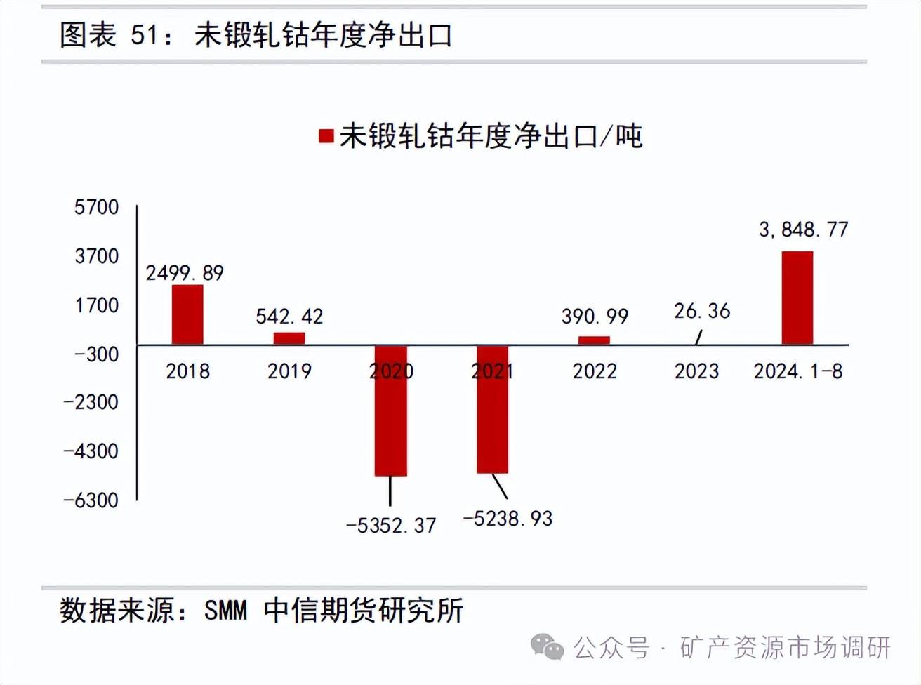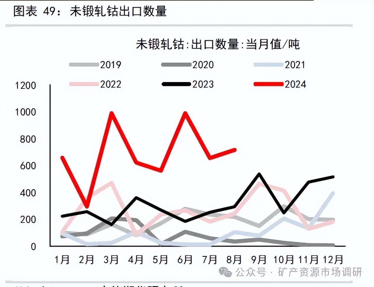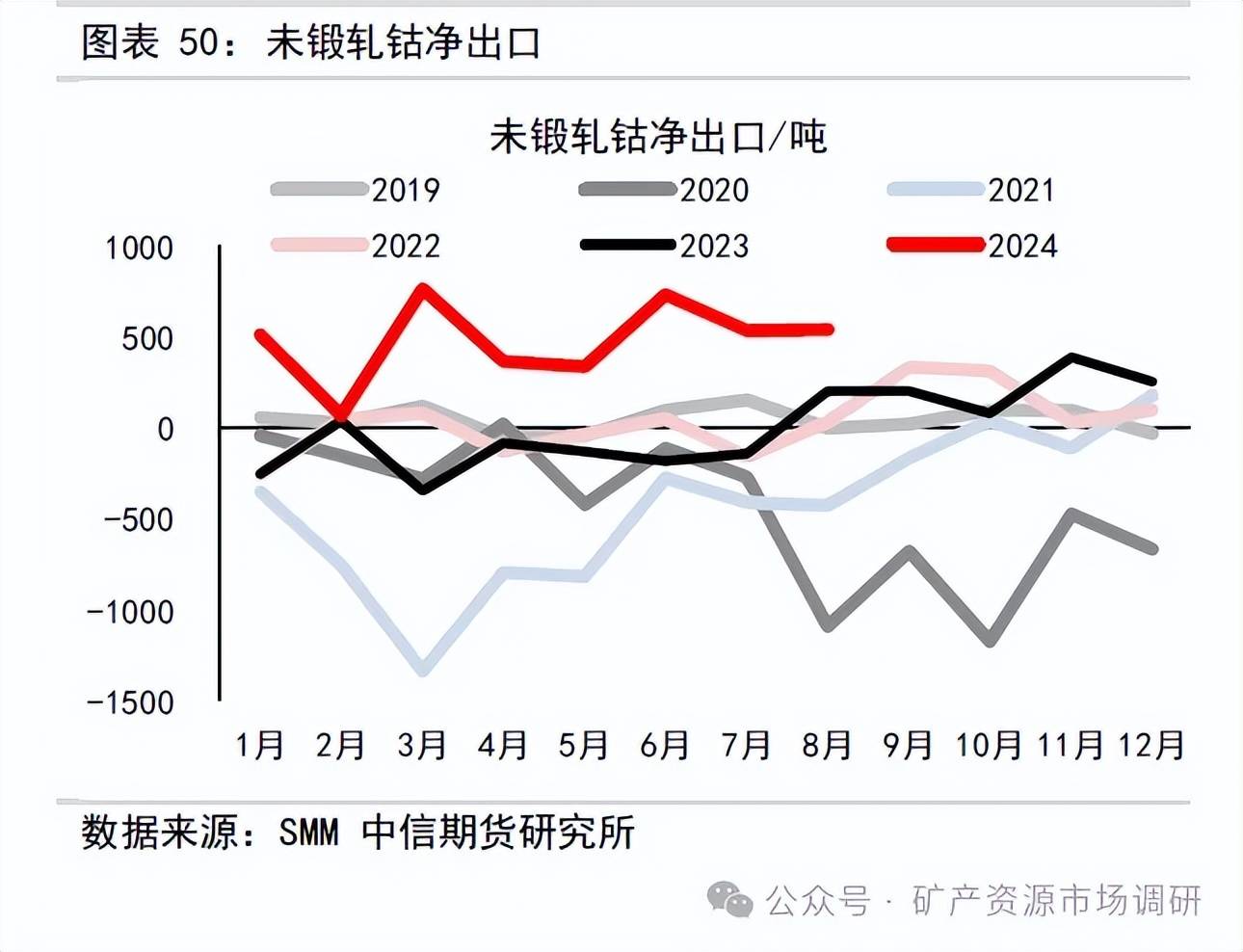 2024 年8 月未鍛軋鈷進(jìn)口數(shù)量177 噸,環(huán)比增加47.5%,同比+95%;1-8 月年未鍛軋鈷累計(jì)進(jìn)口數(shù)量1630 噸,同比減少44%;2024 年8 月未鍛軋鈷出口數(shù)量715.75 噸,環(huán)比+9.38%,同比增加145.4%;1-8 月年未鍛軋鈷累計(jì)出口數(shù)量5478 噸,同比增加175%;2024 年8 月未鍛軋鈷凈出口數(shù)量538.75 噸,環(huán)比+0.8%,同比增加168%;1-8 月年未鍛軋鈷累計(jì)凈出口數(shù)量3848.8 噸,同比去年同期增加4751 噸。