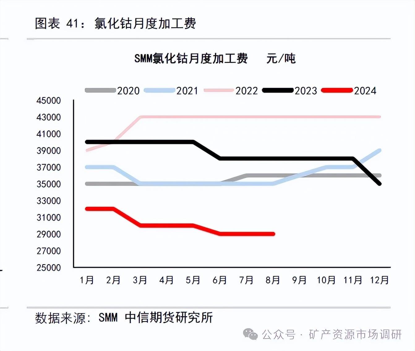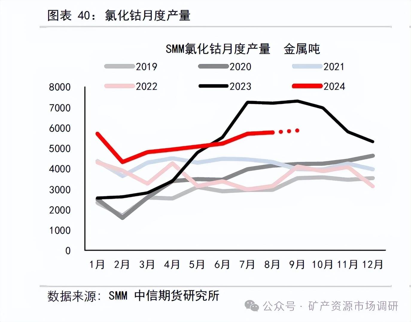 2018-2023 年我國(guó)氯化鈷產(chǎn)量總體呈現(xiàn)先增后減態(tài)勢(shì),2023 全年累計(jì)生產(chǎn)氯化鈷6.147 萬(wàn)噸,同比增加41%;2022 年累計(jì)生產(chǎn)氯化鈷4.35 萬(wàn)噸。2023 年氯化鈷平均加工費(fèi)38583 元/噸,同比減少9%, 2022 年氯化鈷平均加工費(fèi)42416 元/噸,同比增加17.5%。2024 年8 月中國(guó)氯化鈷產(chǎn)量為5759 金噸,環(huán)比+1.7%,同比-19.7%;1-8 月氯化鈷累計(jì)產(chǎn)量41490 金噸,同比增長(zhǎng)14.9%。8 月氯化鈷加工費(fèi)29000 元/噸。預(yù)計(jì)四季度氯化鈷供給總量15210 金屬?lài)嵶笥遥h(huán)比減少8%左右。
