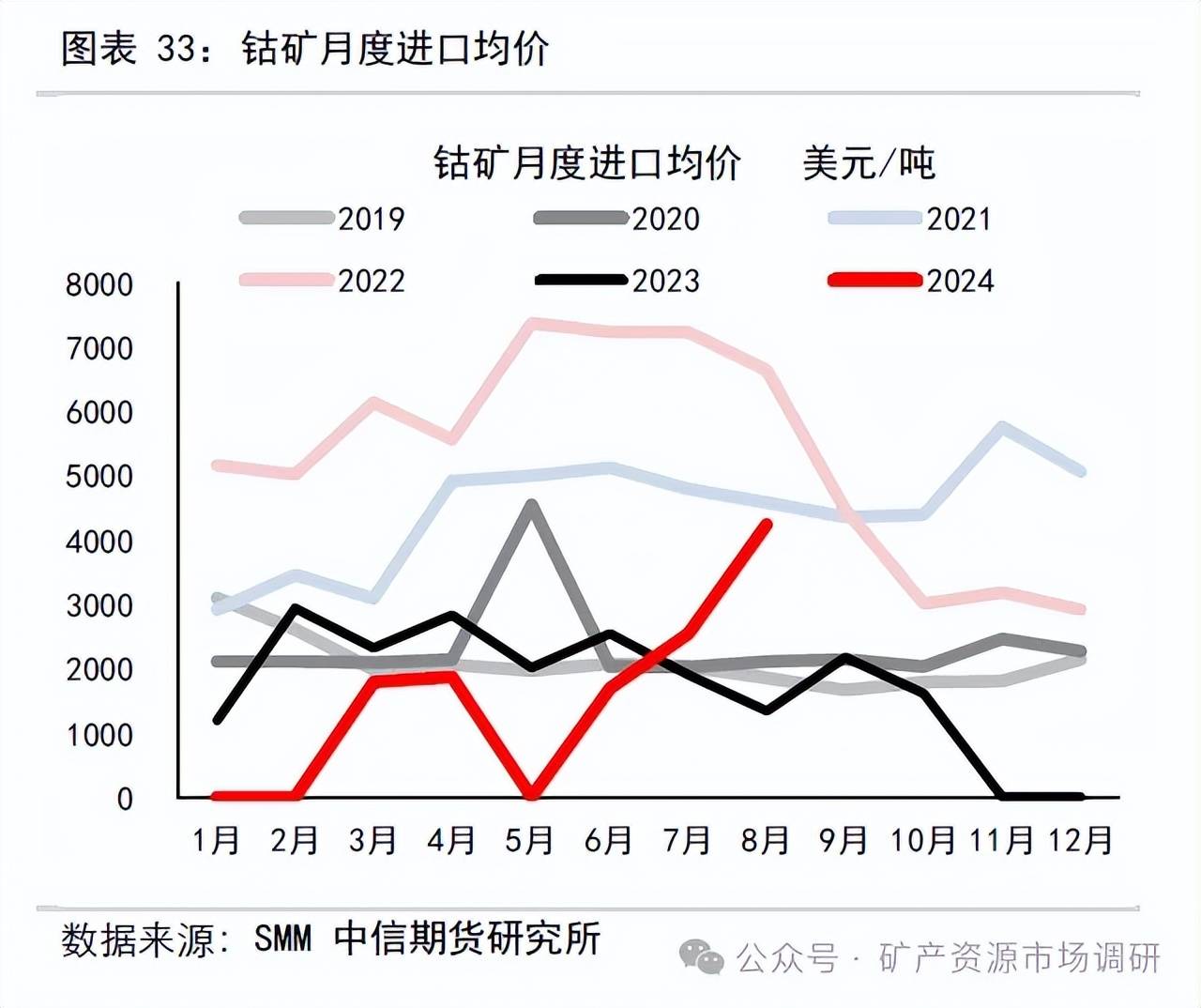 2018-2023 年,我國(guó)鈷礦進(jìn)口呈現(xiàn)逐步減少態(tài)勢(shì),2023 全年累計(jì)進(jìn)口鈷礦1.87萬(wàn)噸,同比減少31%,其中,剛果金進(jìn)口量占比99%。2024 年8 月進(jìn)口鈷礦1 噸,同比-99%;其中來(lái)自南非1 噸。2024 年1-8 月累計(jì)進(jìn)口884 噸,同比減少95%。8 月鈷礦月度進(jìn)口均價(jià)4235 美元/噸,環(huán)比+67%,同比+217%。