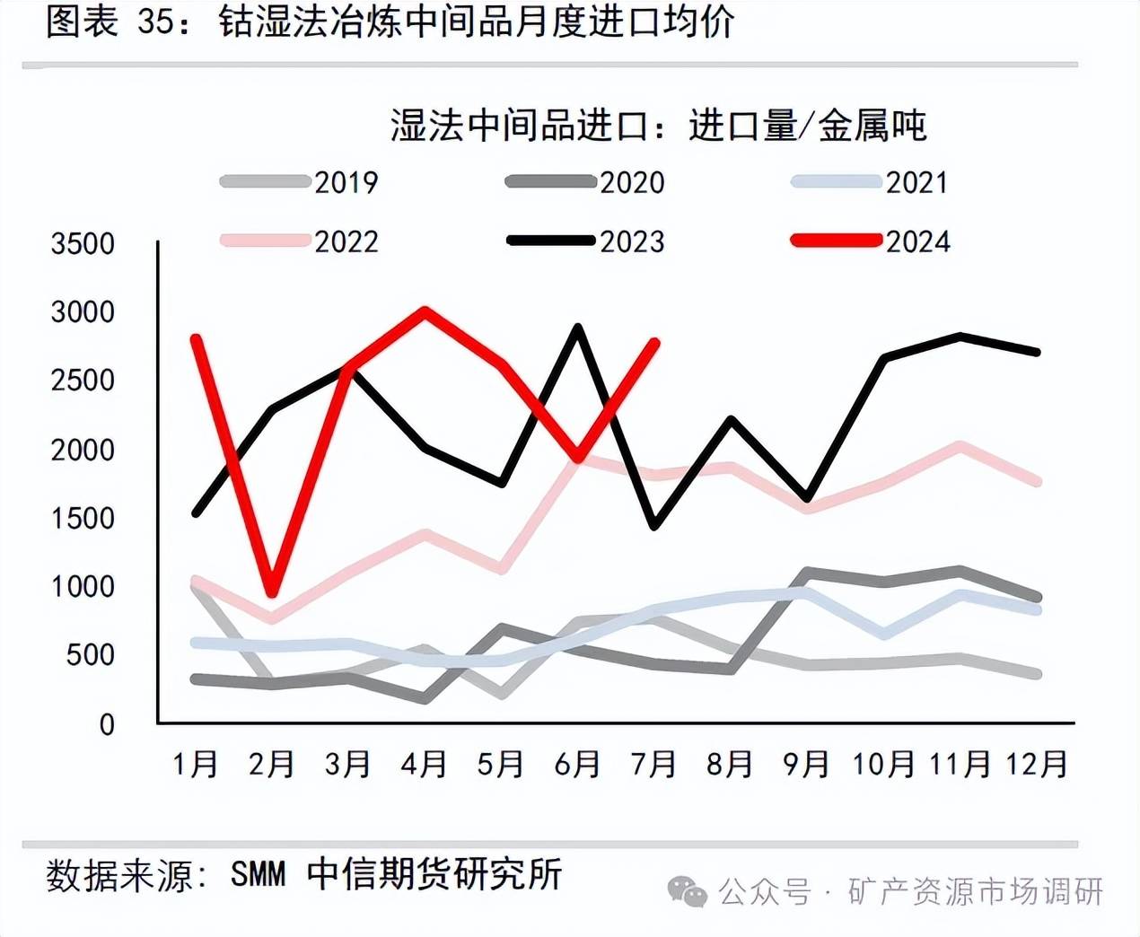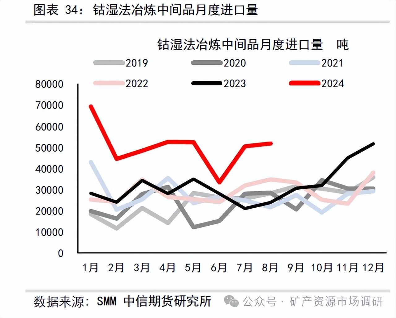 2022 全年累計(jì)進(jìn)口鈷濕法中間品34.66 萬(wàn)噸,剛果金進(jìn)口量占比99.3%。2024 年1-8 月中國(guó)鈷中間品進(jìn)口總量40.29 萬(wàn)噸,同比上漲81%。2024 年8 月鈷濕法中間品進(jìn)口平均價(jià)格4729 美元/噸,環(huán)比+0.8%,同比減少28%。 2024 年7 月濕法中間品進(jìn)口含鈷量2757.38 金屬?lài)崳h(huán)比+43%,同比+94%。