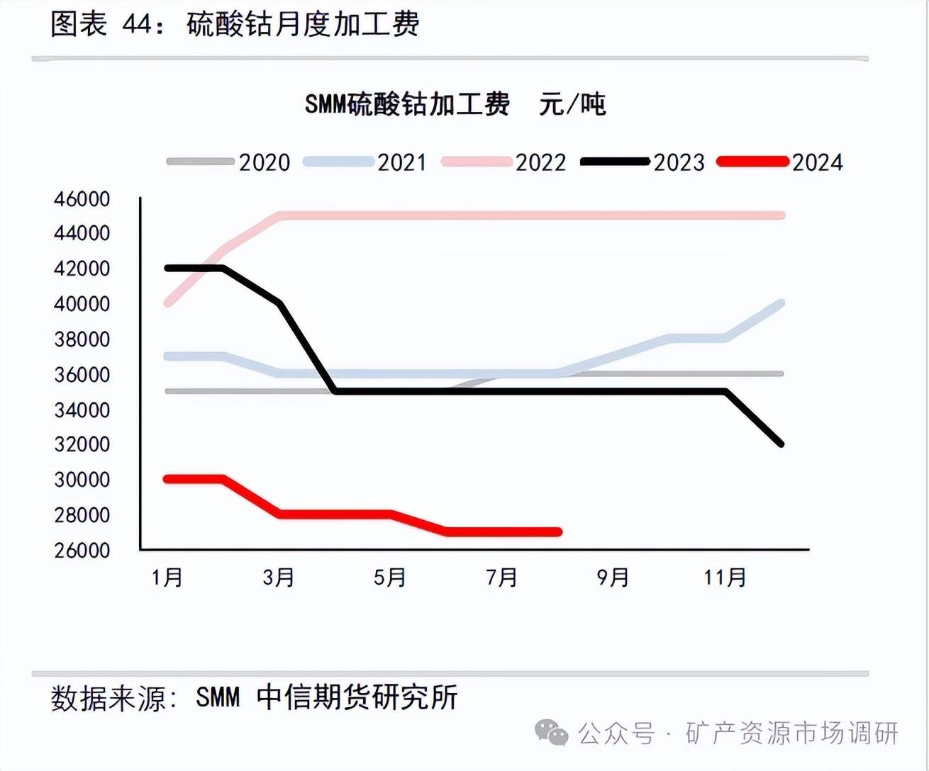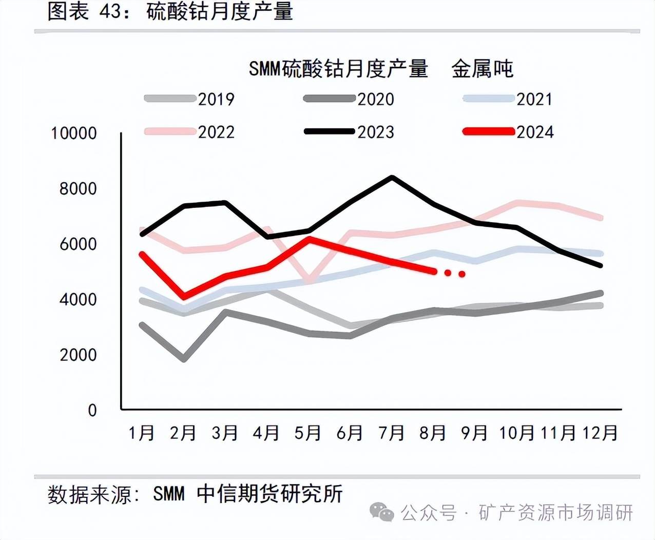 2018-2023 年我國(guó)硫酸鈷產(chǎn)量總體呈現(xiàn)增加態(tài)勢(shì),2023 全年累計(jì)生產(chǎn)硫酸鈷8.02 萬(wàn)噸,同比增加4.2%;2022 全年累計(jì)生產(chǎn)硫酸鈷7.69 萬(wàn)噸,同比增加29%。2023 年硫酸鈷平均加工費(fèi)36333 元/噸,同比減少18.2%,2022 年硫酸鈷平均加工費(fèi)44417 元/噸。2024 年國(guó)內(nèi)硫酸鈷產(chǎn)能162 萬(wàn)噸左右,2024 年8 月中國(guó)硫酸鈷產(chǎn)量4976 金噸,環(huán)比-6.4%,同比-32.8%;1-8 月硫酸鈷累計(jì)產(chǎn)量41723 噸,同比減少26.9%。8 月硫酸鈷加工費(fèi)27000 元/噸,環(huán)比持平。預(yù)計(jì)四季度硫酸鈷供給總量15680 金屬?lài)嵶笥?,環(huán)比減少0.1%左右。