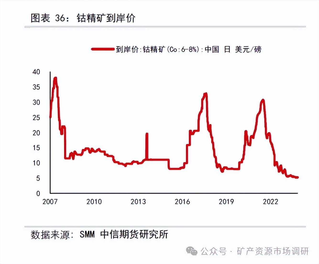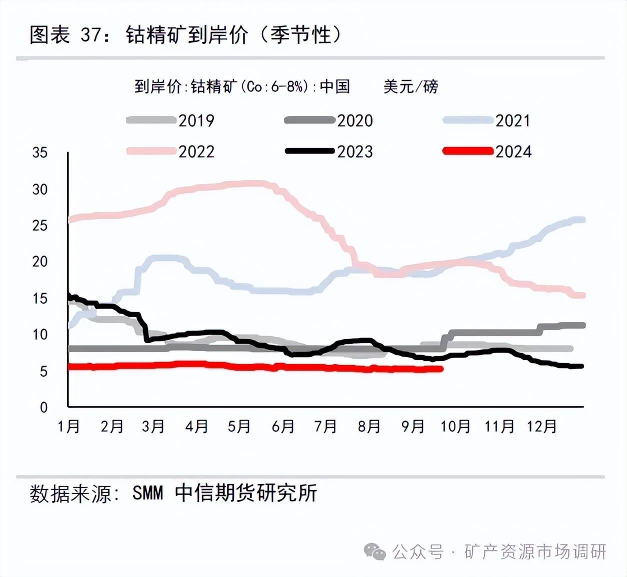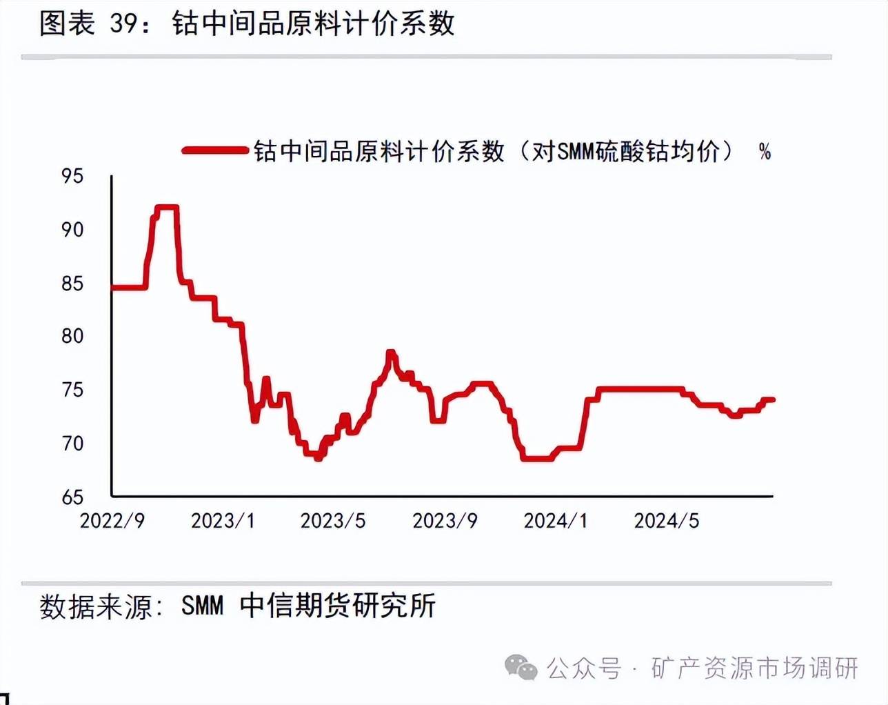 當(dāng)前鈷資源端的價(jià)格同樣處于歷史周期底部,甚至已跌破歷史最低鈷精礦價(jià)格。鈷精礦(Co6-8%)到岸價(jià)格5.2 美元/磅,SMM 鈷中間品(25%-35%)(CIF 中國(guó))6.29 美元/磅,鈷中間品原料計(jì)價(jià)系數(shù)74%。