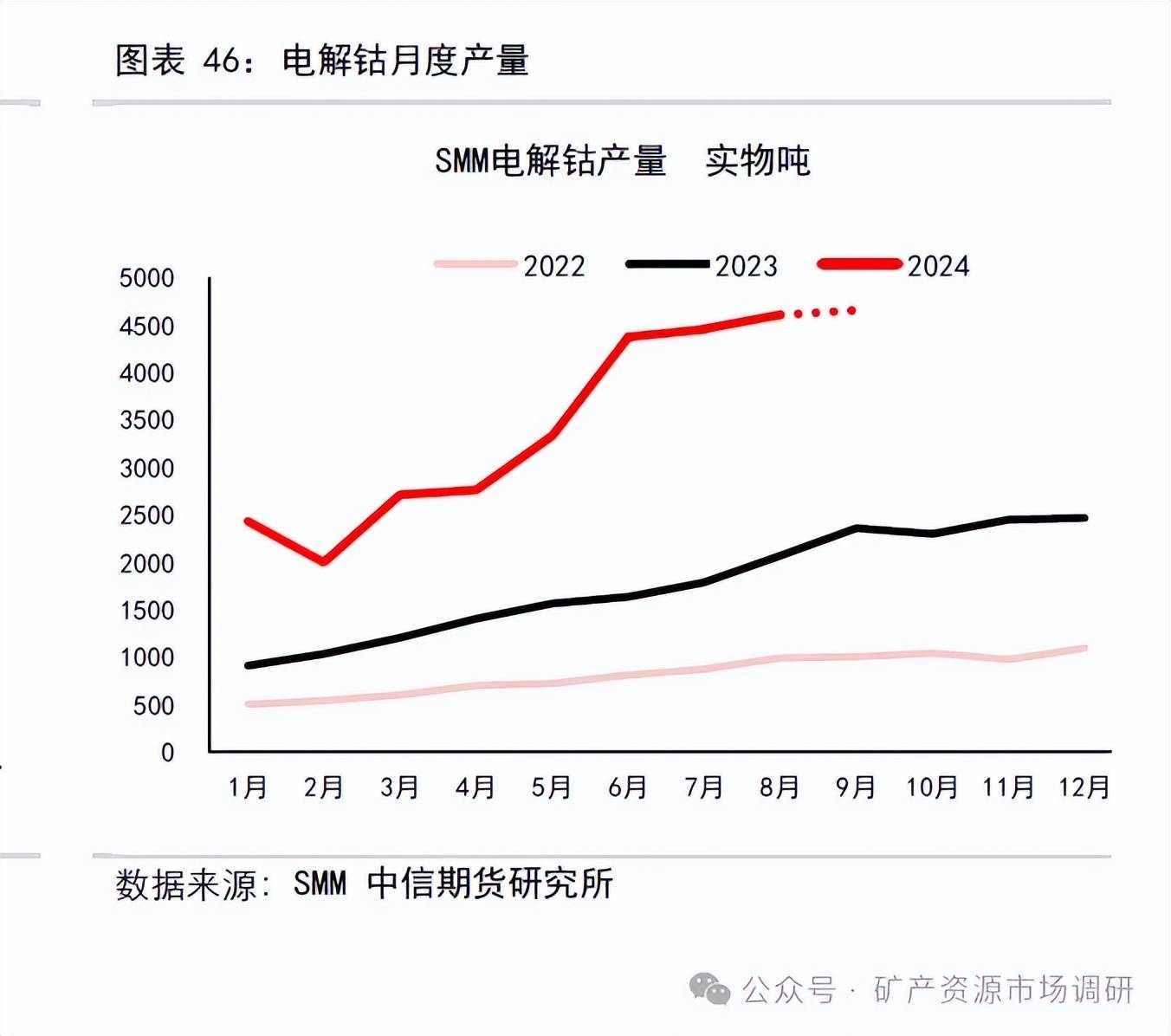 2020-2023 年,我國(guó)電解鈷產(chǎn)量總體呈現(xiàn)增加態(tài)勢(shì),根據(jù)SMM 統(tǒng)計(jì),2023 年國(guó)內(nèi)電解鈷產(chǎn)量2.11 萬(wàn)噸,同比增加115%;2022 全年累計(jì)生產(chǎn)電解鈷9836 噸。2024 年全國(guó)已建成電解鈷產(chǎn)能5.655 萬(wàn)噸左右,2024 年8 月國(guó)內(nèi)電鈷產(chǎn)量4600噸,環(huán)比+3.3%,同比增加97.2%;1-8 月產(chǎn)量26640 噸,同比增長(zhǎng)130.0%。2024年8 月電解鈷價(jià)格18.6 元/噸,環(huán)比下降10.05%,同比減少30.3%。8 月國(guó)內(nèi)電解鈷月度產(chǎn)能5670 噸,環(huán)比持平。預(yù)計(jì)四季度電解鈷供給總量13940 金屬?lài)嵶笥遥h(huán)比+2.6%左右。