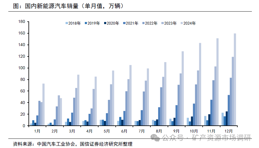 國內(nèi)新能源車單月銷量迭創(chuàng)新高。2024年,從4月汽車以舊換新政策出臺,到7月底補貼力度再度加碼,國內(nèi)新能源車單月銷量持續(xù)創(chuàng)歷史新高,12月單月銷量已達到接近160萬輛。4月底,商務(wù)部、財政部等七部委聯(lián)合出臺了《汽車以舊換新補貼實施細則》,對報廢燃油或新能源乘用車并購買新能源乘用車新車的用戶,一次性給予1萬元置換補貼。7月,國家發(fā)展改革委、財政部聯(lián)合印發(fā)的《關(guān)于加力支持大規(guī)模設(shè)備更新和消費品以舊換新的若干措施》提出,提高汽車報廢更新補貼標準,對報廢符合標準的舊車并購買新能源乘用車的,由原來的補貼1萬元提高到2萬元,對符合標準的燃油乘用車的補貼增至1.5萬元,實施時間為2024年7月24日至2024年12月31日24時。2024年,國內(nèi)新能源車銷量總計約1286.6萬輛,同比增長35.5%,新能源車銷量占汽車新車總銷量的40.9%,較2023年提高9.3個百分點。分類型看,純電動汽車總銷量為771.9萬輛,占比60%;插電式混合動力汽車總銷量為514.1萬輛,占比40%。另外對于2025年中國新能源汽車市場發(fā)展預期,中汽協(xié)預計,全年銷量或達到1600萬輛,同比增長24.4%。