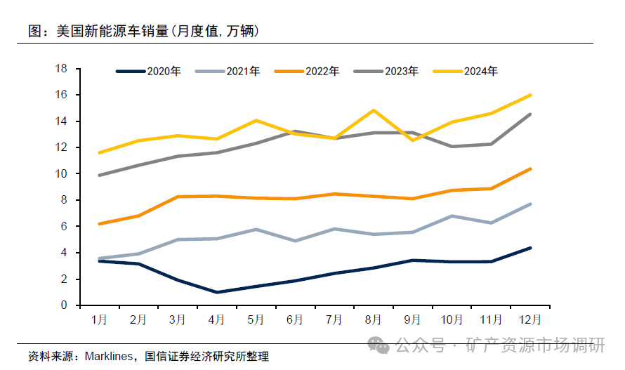 美國市場面臨政策調(diào)整的不確定性。據(jù)統(tǒng)計,2024年美國新能源車銷量約為161.3萬輛,同比增長約10%,總體不及年初時的預測,主要是由于美國市場新車型相對有限。2022年8月16日,美國總統(tǒng)拜登在白宮簽署《通脹縮減法案》,該法案是美國有史以來針對氣候能源領(lǐng)域的最大投資計劃,IRA法案針對新能源車核心補貼政策為提供7500美元新車稅收抵免補貼政策,且取消了對每個車企20萬輛的補貼上限。美國市場目前仍在IRA法案框架下,其中約60%的電車銷量受益于補貼。美國新總統(tǒng)特朗普上任之后,可能會調(diào)整政策,但預計對2025年影響相對有限。2025年,預計美國新能源車銷量有望達到180萬輛以上,同比增長超過10%。