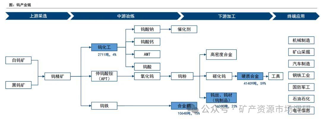 鎢產(chǎn)業(yè)鏈從鎢礦的勘探采選、冶煉,延伸到鎢的深加工,最終應(yīng)用于泛工業(yè)領(lǐng)域。鎢行業(yè)上游以黑白鎢礦勘探采選為主,中游主要是"鎢精礦-仲鎢酸銨(APT)-鎢粉"冶煉,下游包括鎢材、鎢絲、硬質(zhì)合金等材料加工,而更下級的需求主體包括機(jī)械制造、汽車制造、電子信息等行業(yè)。