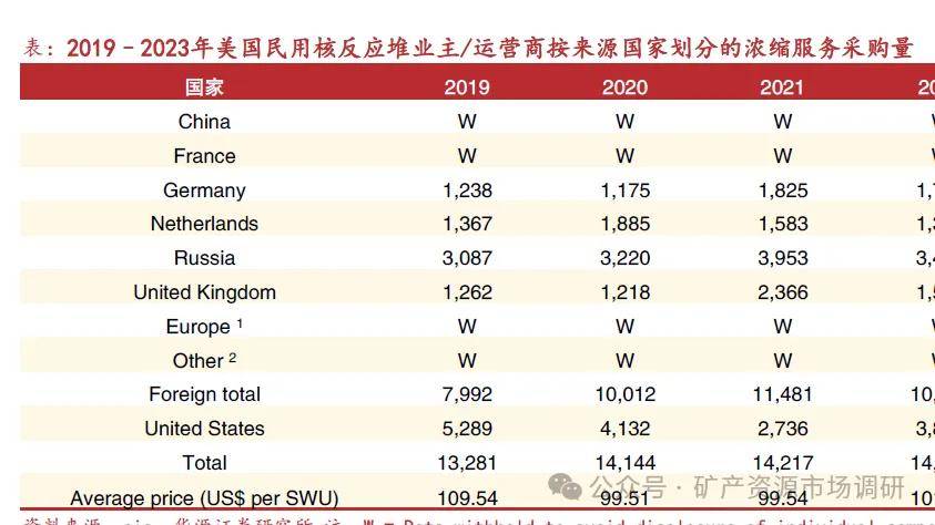 美國針對進口俄羅斯?jié)饪s鈾實施禁令,目標(biāo)切斷加工環(huán)節(jié)依賴,推動美國國內(nèi)核燃料供應(yīng)鏈發(fā)展。2024年5月13日,美國總統(tǒng)拜登簽署法案,正式禁止進口俄羅斯?jié)饪s鈾。在90天后,美國企業(yè)和機構(gòu)不得從俄羅斯進口低濃鈾,除非獲得美國能源部專門豁免。能源部發(fā)放豁免的前提是美國核反應(yīng)堆燃料需求無法從其他可靠來源得到滿足,或進口行為符合國家利益。任何獲準(zhǔn)的豁免進口量都將受到限制,且僅能持續(xù)至2028年1月1日。法案還授權(quán)聯(lián)邦政府支配國會早前批準(zhǔn)的27.2億美元資金,用于提升美國本土鈾濃縮能力。俄羅斯目前是全球最大的鈾濃縮服務(wù)供應(yīng)商和唯一的高豐度低濃鈾供應(yīng)商。根據(jù)美國能源信息管理局公布的數(shù)據(jù),俄是美2023年最大的鈾濃縮服務(wù)進口來源國,占有27%的市場份額。