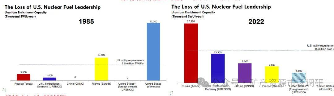 從曼哈頓計劃初期到 20 世紀(jì) 80 年代中期,美國一直是核濃縮領(lǐng)域的世界領(lǐng)先者,然而,到20世紀(jì)80年代中期,隨著全球核能市場的競爭加劇,其他國家,如俄羅斯、法國和英國,逐漸增強了鈾濃縮能力,這使得美國的核燃料產(chǎn)業(yè)逐漸失去市場份額。此外,隨著冷戰(zhàn)結(jié)束和全球核能需求放緩,美國在核燃料領(lǐng)域的投入減少,直到2013 年美國關(guān)閉了其最后一個濃縮設(shè)施。美國不得不依賴其他國家的濃縮鈾供應(yīng),尤其是從俄羅斯和歐洲進口,以滿足國內(nèi)核電站的需求,美國的核燃料產(chǎn)業(yè)進入了一個新的階段,依賴進口和技術(shù)外包。