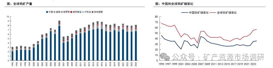 全球鎢礦產(chǎn)量83%。其他主要生產(chǎn)國還包括越南、俄羅斯、玻利維亞、盧旺達等。2024年全球鎢礦儲采比57年,中國鎢礦儲采比36年。