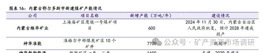 內(nèi)蒙古積極推動(dòng)符合條件的煤礦產(chǎn)能核增手續(xù)辦理,產(chǎn)能穩(wěn)定接續(xù)。內(nèi)蒙古2024年原煤產(chǎn)量同比增長5.4%達(dá)12.97億噸,原煤產(chǎn)量躍居國內(nèi)首位。存量產(chǎn)能來看,其中原煤產(chǎn)量主要集中在鄂爾多斯市,鄂爾多斯市含煤區(qū)面積約6.1萬平方公里,占全市總面積的70%以上,探明儲(chǔ)量2560億噸,約占內(nèi)蒙古總儲(chǔ)量2/3、全國1/6。截至2024年11月,鄂爾多斯市累計(jì)有87座煤礦獲得產(chǎn)能核增批復(fù),核增產(chǎn)能超1.5億噸/年。遠(yuǎn)期鄂爾多斯新增產(chǎn)能預(yù)計(jì)為12400萬噸/年,其中準(zhǔn)格爾中部煤炭礦區(qū)規(guī)劃10個(gè)礦井新增產(chǎn)能較多,規(guī)劃遠(yuǎn)期產(chǎn)能將增加7700萬噸/年。