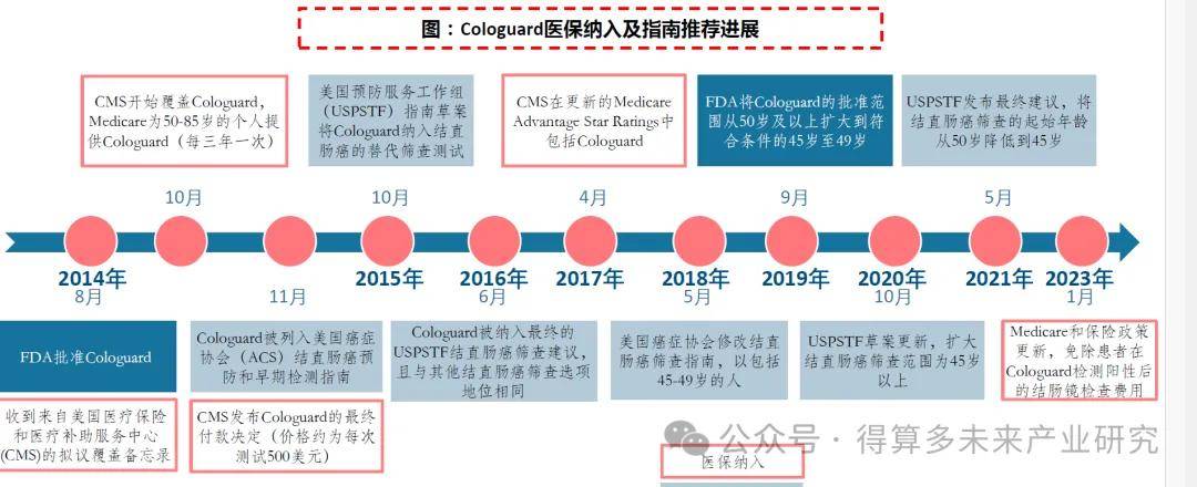 務(wù)中心)首次同時(shí)審查醫(yī)療設(shè)備。在FDA批準(zhǔn)Cologuard的同月,Exact Sciences收到來(lái)自CMS的擬議覆蓋備忘錄,并于兩個(gè)月后開(kāi)始覆蓋Cologuard。FDA和CMS的首次聯(lián)合平行審查試點(diǎn)計(jì)劃,縮短了產(chǎn)品從FDA批準(zhǔn)到醫(yī)療保險(xiǎn)覆蓋之間的時(shí)間,帶來(lái)Cologuard快速放量。除了醫(yī)保納入外,監(jiān)管獲批也為指南推薦鋪平道路,獲批后公司Cologuard產(chǎn)品相繼被美國(guó)癌癥協(xié)會(huì)(ACS)、美國(guó)預(yù)防服務(wù)工作組(USPSTF)納入指南,作為結(jié)直腸癌預(yù)防和早期檢測(cè)。后續(xù)ACS和USPSTF相繼修改指南進(jìn)一步擴(kuò)大建議篩查的年齡范圍。整體來(lái)看醫(yī)保納入及指南推薦帶來(lái)核心產(chǎn)品放量。