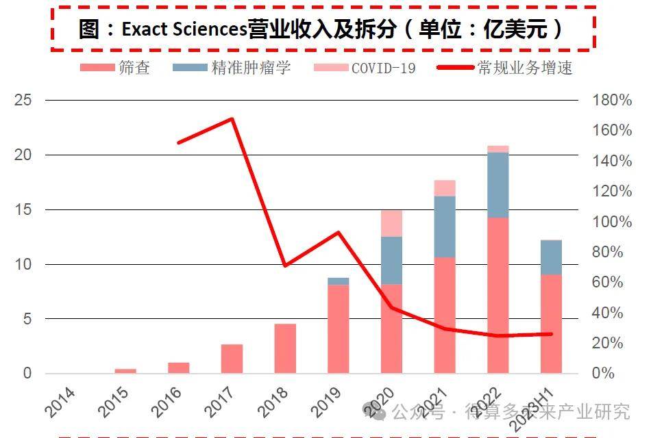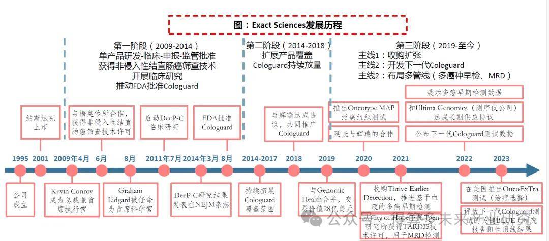 腸癌早篩龍頭,并購(gòu)整合擴(kuò)張。Exact Sciences成立于1995年,公司致力于癌癥早期檢測(cè),2009年公司與梅奧診所合作,獲得非侵入性結(jié)直腸癌篩查技術(shù)許可,2014年代表產(chǎn)品Cologuard獲FDA批準(zhǔn)上市。此后公司在癌癥早期檢測(cè)、療法選擇、MRD等領(lǐng)域進(jìn)行多項(xiàng)并購(gòu)。目前公司在腸癌早篩產(chǎn)品領(lǐng)域處于龍頭地位,同時(shí)多項(xiàng)管線的臨床研究正在持續(xù)開(kāi)展中。