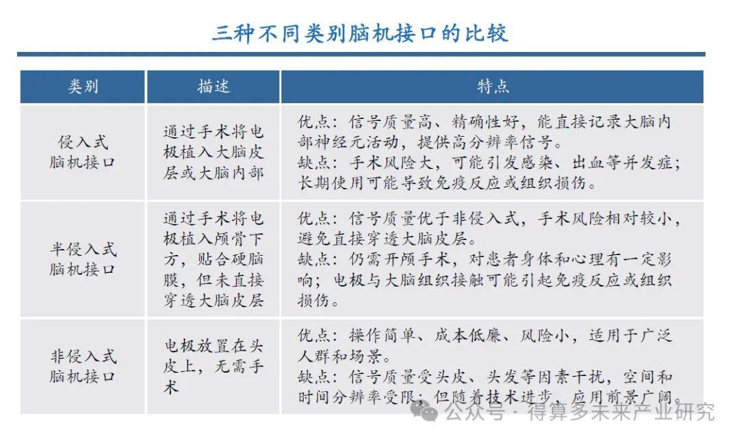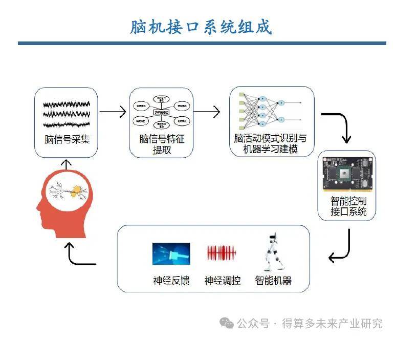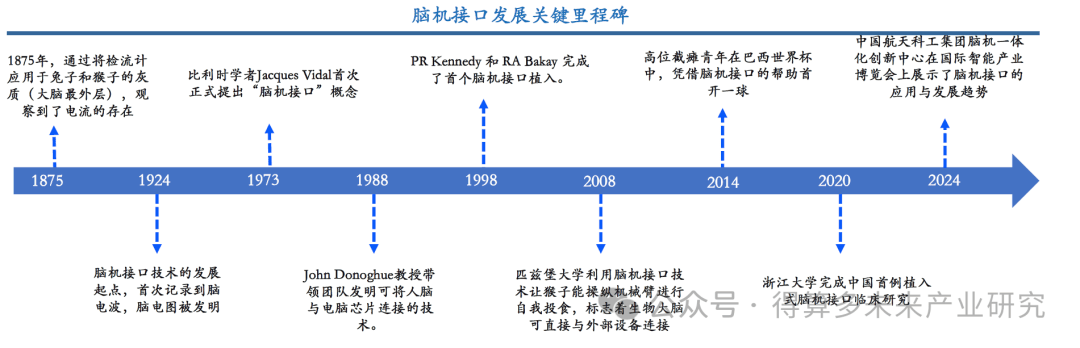 n 1)學(xué)術(shù)探索階段,主要在20世紀(jì)20年代至70年代,1924年腦電波首次被記錄,為后續(xù)腦機接口的研究奠定了基礎(chǔ);2)科學(xué)論證階段,主要在20世紀(jì)70年代至2000年,1973年腦機接口的概念正式被提出,1988年John Donoghue教授帶領(lǐng)團隊發(fā)明可將人腦與電腦芯片連接的技術(shù),1998年P(guān)R Kennedy 和 RA Bakay 完成了首個腦機接口植入,是侵入式腦機接口研究的突破;3)應(yīng)用實驗階段,主要從2000年至今,腦機接口的各種應(yīng)用被陸續(xù)開發(fā),2004年,在巴西世界杯上,一位截肢殘疾者通過腦機接口和機械外骨骼開球,2020年,我國浙江大學(xué)完成中國首例植入式腦機接口臨床研究。