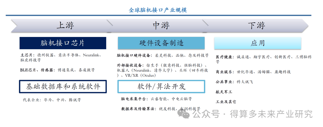 腦機接口產(chǎn)業(yè)鏈主要涉及軟件和硬件兩部分。上游主要是腦機接口芯片和基礎(chǔ)數(shù)據(jù)庫和系統(tǒng)軟件、中游主要包括硬件設(shè)備制造與軟件/算法開發(fā)、下游主要是腦機接口的應(yīng)用。