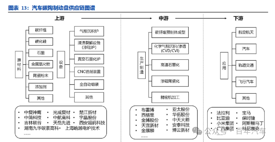 碳陶制動盤產(chǎn)業(yè)呈現(xiàn)三段式價值鏈分布結(jié)構(gòu):上游原材料供應與設備、中游制造加工以及下游應用。上游原材料供應環(huán)節(jié)聚焦于關(guān)鍵材料的基礎(chǔ)保障,上游主要涉及碳纖維、陶瓷粉末等原材料的提取、采購與初步加工;中游制造加工環(huán)節(jié)以先進工藝驅(qū)動技術(shù)創(chuàng)新與降本,包括預制體制備、陶瓷化處理(化學氣相滲透CVI、液態(tài)聚合物滲透LPI 或其它組合技術(shù))等關(guān)鍵流程;下游終端應用覆蓋航空航天、汽車、軌道交通及新興領(lǐng)域,產(chǎn)業(yè)需求多元化增長。