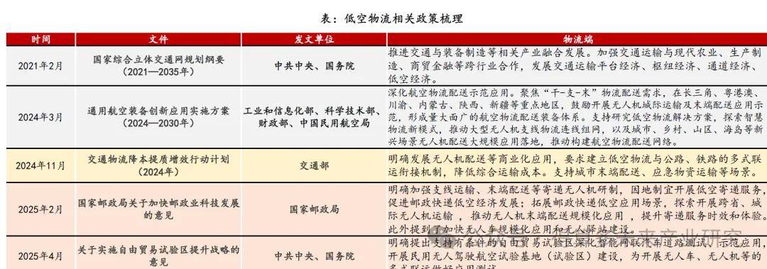 ◥ 《通用航空裝備創(chuàng)新應(yīng)用實(shí)施方案(2024-2030年)》提出聚焦“干-支-末”物流配送需求,在長(zhǎng)三角、粵港澳川渝、內(nèi)蒙古、陜西、新疆等重點(diǎn)地區(qū),鼓勵(lì)開(kāi)展無(wú)人機(jī)城際運(yùn)輸及末端配送應(yīng)用示范,形成量大面廣的航空物流配送裝備體系。支持研究低空物流解決方案,探索智慧物流新模式,推動(dòng)大型無(wú)人機(jī)支線物流連線組網(wǎng),以及城市、鄉(xiāng)村、山區(qū)、海島等新興場(chǎng)景無(wú)人機(jī)配送大規(guī)模應(yīng)用落地,推動(dòng)構(gòu)建航空物流配送網(wǎng)絡(luò)。