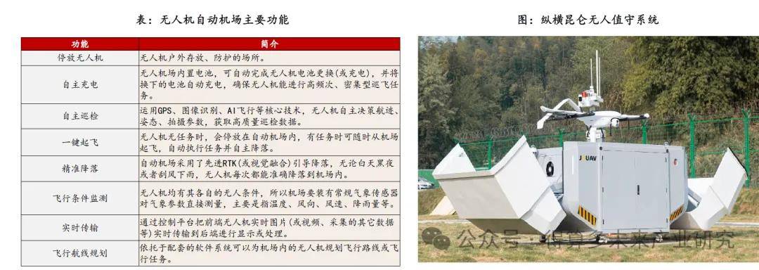 ◥ 無(wú)人值守系統(tǒng)通常包括機(jī)場(chǎng)艙體、升降平臺(tái)、自動(dòng)歸中系統(tǒng)、自動(dòng)充電系統(tǒng)、氣象站、UPS、工業(yè)空調(diào)等,可在預(yù)定場(chǎng)景下完成無(wú)人機(jī)的自主起降、航線規(guī)劃、任務(wù)執(zhí)行、數(shù)據(jù)回傳及維護(hù)管理,廣泛應(yīng)用于安防監(jiān)控、交通巡檢、電力巡檢等領(lǐng)域。