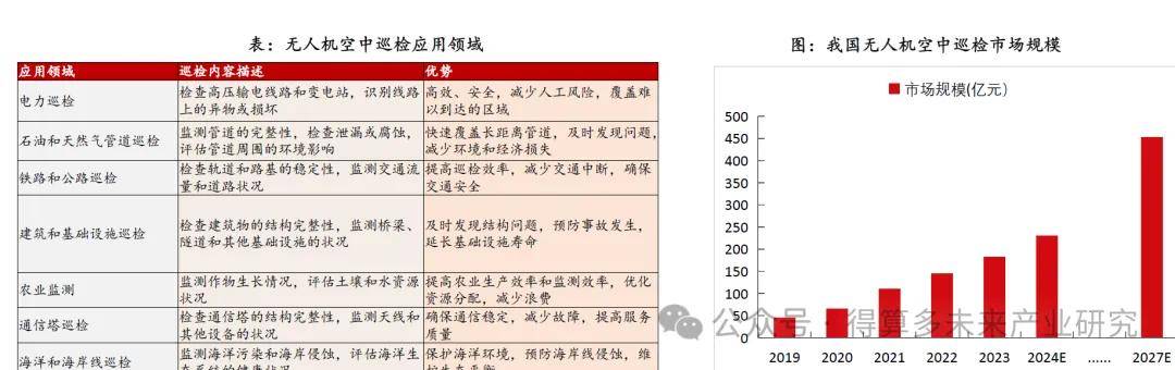 ◥ 2023年我國(guó)無(wú)人機(jī)巡檢市場(chǎng)規(guī)模為183億元,預(yù)計(jì)到2027年將達(dá)到452億元。電力巡檢是無(wú)人機(jī)重要應(yīng)用場(chǎng)景之一,2023年中國(guó)電力巡檢無(wú)人機(jī)行業(yè)市場(chǎng)規(guī)模為68.31億元。
