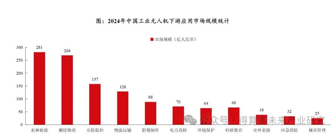 從應(yīng)用領(lǐng)域來(lái)看,工業(yè)無(wú)人機(jī)的主要應(yīng)用領(lǐng)域包括地理測(cè)繪、電力巡檢、應(yīng)急救援、航空攝影、水利應(yīng)用等。從2024年無(wú)人機(jī)下游應(yīng)用市場(chǎng)規(guī)模來(lái)看,農(nóng)林植保(281億)與測(cè)繪勘查(268億)占據(jù)市場(chǎng)規(guī)模頭部;安防監(jiān)控(157億)、物流運(yùn)輸(128億) 構(gòu)成第二梯隊(duì);其他場(chǎng)景市場(chǎng)規(guī)模相對(duì)偏小。