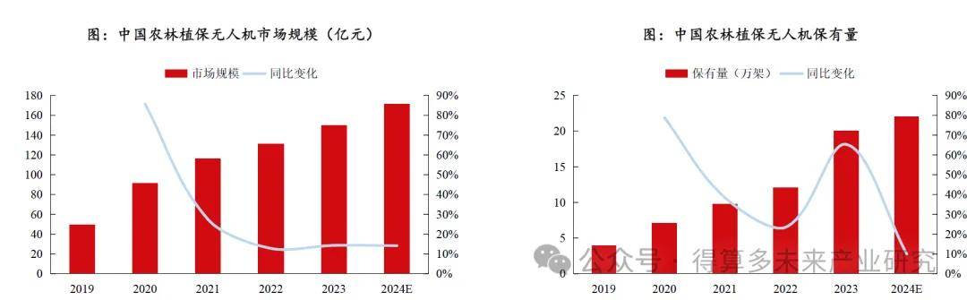 ◥ 2023年我國(guó)無(wú)人機(jī)保有量超過(guò)20萬(wàn)架,同比增加65%。2023年農(nóng)林植保無(wú)人機(jī)市場(chǎng)規(guī)模為150億元,同比上升14%,預(yù)期2024年可達(dá)171億元。