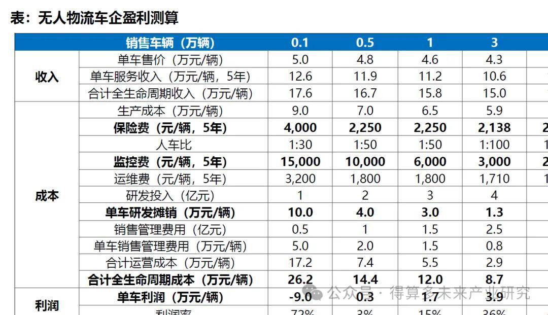 規(guī)?;瘜Τ杀緮備N顯著,新增銷售規(guī)模0.5萬輛,全生命周期可實現(xiàn)盈利,且隨規(guī)模提升,盈利大幅改善。收入相對剛性,整車售價+運營服務(wù)(基本為0.7萬元/季度),一次性購買5年可享有折扣。當銷量0.5萬輛算。成本端,車生產(chǎn)需7萬元/輛;費用端,保險費為一年400-500元/輛,人車比1:50,監(jiān)控費基本為2000元/輛/年,其次研發(fā)投入按照一年2億,對應(yīng)單車研發(fā)費用4萬元/輛,銷售管理一年投入1億,對應(yīng)單車攤銷2萬元,全生命周期成本14萬元+,基本盈虧平衡。但隨著運營規(guī)模提升,單車利潤大幅提升,我們測算,當銷量達到5萬輛,單車利潤為4.3萬元/輛,凈利率40%+。