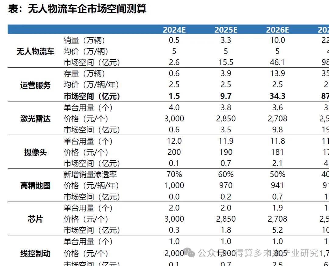 若2030年銷售60萬輛無人物流,行業(yè)市場空間運營服務(wù)413.4億>整車244.6億>激光雷達38.9億>線控制動25.6億>芯片23.4億,其余高精地圖、攝像頭空間較小。而整車和運營服務(wù)目前均有無人物流車企提供,其主導產(chǎn)業(yè)鏈,上游零部件與智能化乘用車高度重合,競爭激烈,盈利空間較小。