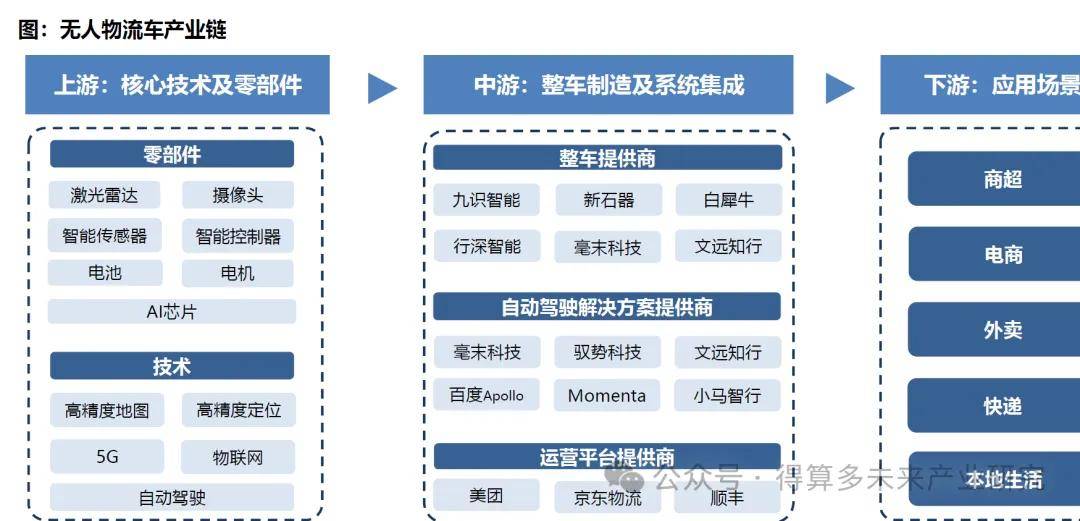 ◆ 無人駕駛物流車產(chǎn)業(yè)鏈具有高度復雜性和技術(shù)集成性,分為上游核心技術(shù)及零部件、中游整車制造與系統(tǒng)集成以及下游應(yīng)用場景三個主要環(huán)節(jié)。