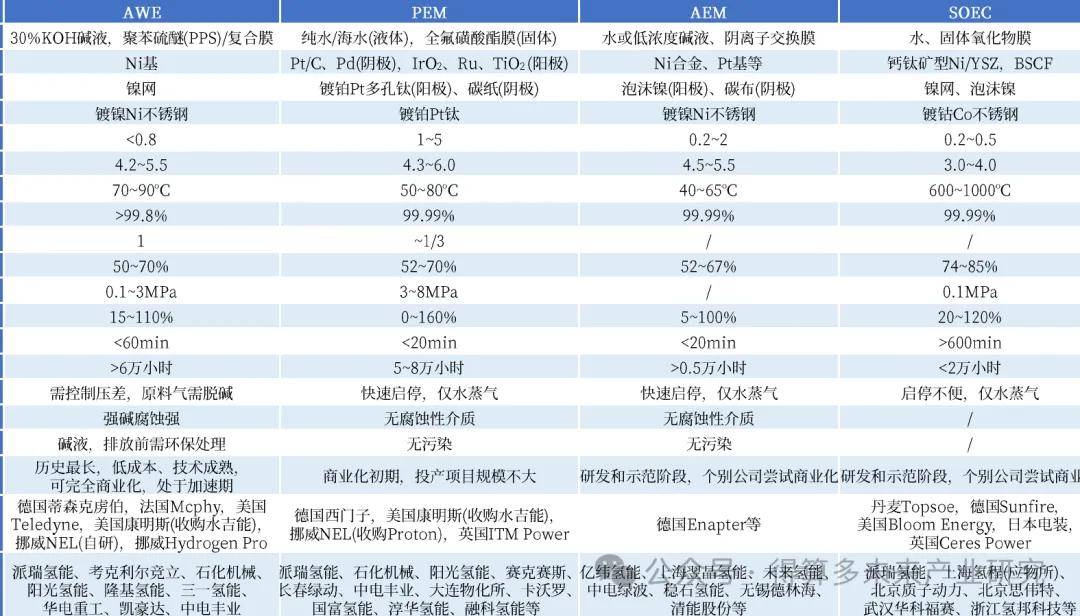 >AWE堿性電解水技術(shù)已發(fā)展數(shù)十年、最早工業(yè)化,其優(yōu)點可使用非貴金屬催化劑、成本較低,且國產(chǎn)化程度高,但在快速啟停和低電壓啟動等方面表現(xiàn)不佳、不適合風光等間歇性電能直驅(qū)運行。國內(nèi)AWE技術(shù)自前單體設(shè)備制氫能力強于海外同行,但其他指標仍有一定差距。