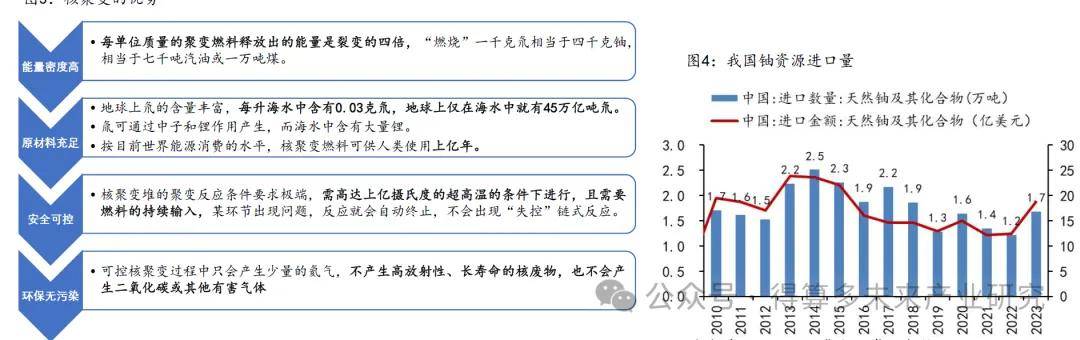 ? 與核裂變相比,可控核聚變釋放能量大,原料來(lái)源豐富,安全可靠、環(huán)境友好、產(chǎn)生的放射性廢物少。能量密度來(lái)看,每單位質(zhì)量的聚變?nèi)剂厢尫懦龅哪芰渴橇炎兊?倍;原材料來(lái)看,聚變?nèi)剂贤ǔJ褂秒碗?,地球上氘?chǔ)量豐富,氚可以通過(guò)中子和鋰制備,而核裂變采用的鈾元素我國(guó)儲(chǔ)量有限仍需進(jìn)口,2023年進(jìn)口量1.7萬(wàn)噸,進(jìn)口金額達(dá)到19億美元;安全性來(lái)看,聚變實(shí)現(xiàn)難度高,且不產(chǎn)生放射性廢料,而核裂變是鏈?zhǔn)椒磻?yīng),難以控制,并產(chǎn)生大量放射性物質(zhì),切爾諾貝利(1986年)和福島(2011年)福島核事故曾造成巨大危害。