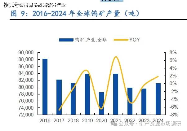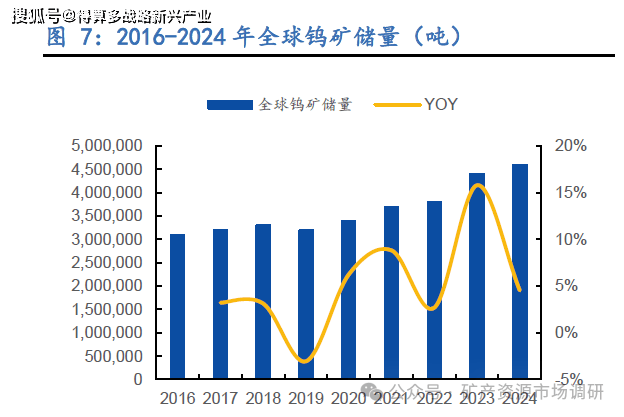 儲(chǔ)量端,全球鎢資源總量整體上升。 據(jù)美國(guó)地質(zhì)調(diào)查局( USGS )統(tǒng)計(jì),自 2016 年起,全球鎢資源儲(chǔ)量整體呈上升趨勢(shì), 202 3 年全球的鎢礦儲(chǔ)量約為 440 萬(wàn)噸,同比增長(zhǎng)15. 8 2024 年全球的鎢礦儲(chǔ)量為 460 萬(wàn)噸,同比增長(zhǎng) 4.6% 。 2024 年增長(zhǎng)相比放緩。全球分布來看,鎢礦儲(chǔ)量集中。