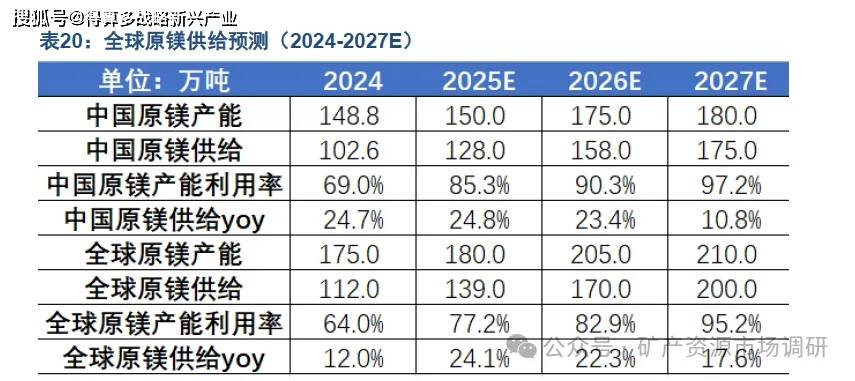 全球原鎂行業(yè)產(chǎn)能利用率有望提升,行業(yè)規(guī)?;蜻M(jìn)入良性擴(kuò)張態(tài)勢(shì)。鎂行業(yè)產(chǎn)業(yè)集群化發(fā)展有助于行業(yè)規(guī)模效益的提升及盈利水平的修復(fù),也意味著行業(yè)的發(fā)展將與新能源產(chǎn)業(yè)的發(fā)展形成有效共振??紤]到鎂金屬作為綠色及新質(zhì)生產(chǎn)力產(chǎn)業(yè)發(fā)展的核心生產(chǎn)要素,綠色化、智能化、移動(dòng)化及輕量化在產(chǎn)品應(yīng)用端的持續(xù)拓展將推動(dòng)鎂行業(yè)下游需求的有效擴(kuò)張,這有助于改變行業(yè)產(chǎn)能利用率偏低的現(xiàn)狀并且進(jìn)一步提升行業(yè)規(guī)模進(jìn)入良性擴(kuò)張態(tài)勢(shì)。從行業(yè)供需平衡角度觀察,考慮到企業(yè)端原鎂產(chǎn)能現(xiàn)有的建設(shè)規(guī)劃與產(chǎn)能利用率的回升,我們認(rèn)為 2024-2027 年間,全球原鎂產(chǎn)量或由 112萬(wàn)噸增至 200 萬(wàn)噸,其中中國(guó)原鎂產(chǎn)量或由 102.6萬(wàn)噸增至 175 萬(wàn)噸。結(jié)合我們下一篇文章對(duì)鎂需求的討論與預(yù)測(cè),我們認(rèn)為 2025-2027 年間,全球原鎂供需缺口