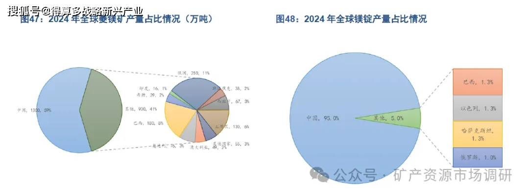 中國(guó)鎂資源儲(chǔ)量豐富,資源稟賦較高。中國(guó)可供采選冶煉的鎂資源主要分布于菱鎂礦、白云石礦與鹽湖資源中。據(jù)國(guó)務(wù)院發(fā)展研究中心統(tǒng)計(jì)(2024年),中國(guó)鎂資源儲(chǔ)量占全球 70%。菱鎂礦方面,根據(jù) USGS 統(tǒng)計(jì)數(shù)據(jù),2024年全球菱鎂礦儲(chǔ)量為77 億噸,且集中度較高,CR3 達(dá)到 54%。其中,俄羅斯(23 億噸,占比 30%),斯洛伐克(12億噸,占比 15%)和中國(guó)(6.8億噸,占比 9%)為全