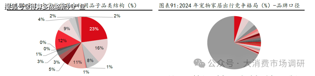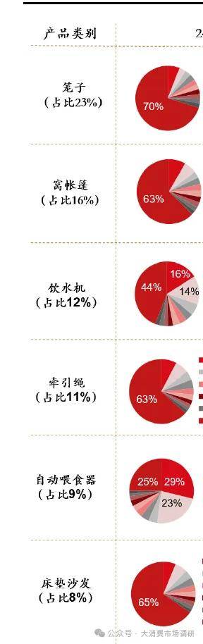 寵物家居出行:與清潔用品類似,仍呈現(xiàn)產(chǎn)品類型多,市場規(guī)模小,格局分散的態(tài)勢。寵物家居出行用品按照其主要功能劃分為居、行、食和其他四個(gè)子品類,分別占比48%/24%/27%/2%。寵物家居出行包含16 種主要產(chǎn)品,各產(chǎn)品市場規(guī)模普遍較小,其中三大電商平臺(tái)銷售額破億的產(chǎn)品有:籠子(6.8 億元,占比23%),窩帳篷(4.7 億元,占比16%),飲水機(jī)(3.5 億元,占比12%),牽引繩(3.3 億元,占比11%),自動(dòng)喂食器(2.7 億元,占比9%),床墊沙發(fā)(2.4 億元,占比8%),背包(1.4 億元,占比5%),喂食碗(1.2 億元,占比4%),其余產(chǎn)品銷售額均不足1 億。 從格局角度看,各產(chǎn)品品牌的市場份額大都比較分散,但產(chǎn)品壁壘相對(duì)較高的自動(dòng)喂食器及飲水機(jī)市場的集中度相對(duì)較高,并持續(xù)提升。從寵物家居出行全品類口徑看,CR1/CR3/CR5/CR10 分別為5%/13%/18%/24%。在三大電商品臺(tái)銷售破億的品牌僅有3 個(gè),其中銷售額最高的品牌為小佩,24 年在三大平臺(tái)寵物家居出行類目下銷售額僅為1.4 億。