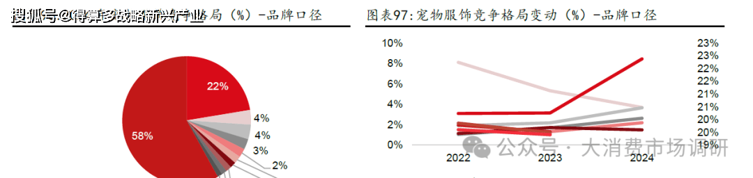 貓狗玩具:產(chǎn)品類型有限,市場空間小,細分品類內(nèi)格局分散程度提升,頭部品牌更新?lián)Q代較快,呈現(xiàn)出“有品類,無品牌”的特性。從產(chǎn)品結(jié)構(gòu)來看,2024 年,貓爬架占比接近50%,三大電商平臺合計銷售額為4.4 億。其次為逗貓棒占比23%,銷售額為4.4/2.1 億,其余產(chǎn)品則未達到億級銷售規(guī)模。從貓狗玩具全品類口徑看,CR1/CR3/CR5/CR10 分別為4%/12%/18%/28%。在三大電商品臺銷售均為破億,其中銷售額最高的品牌為華元寵具,24 年在三大平臺貓狗玩具類目下銷售額僅為4000 萬+。