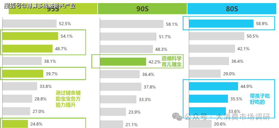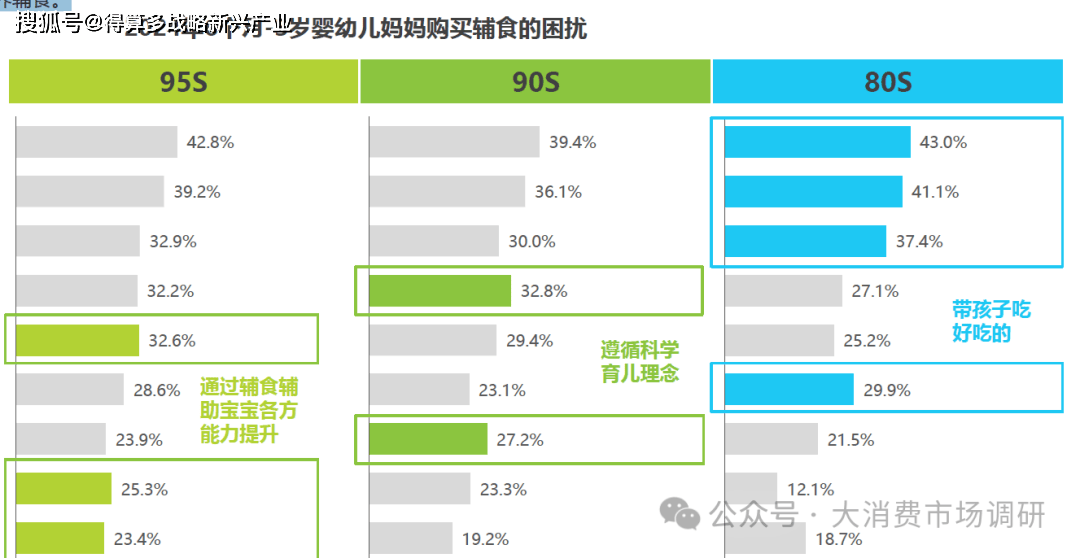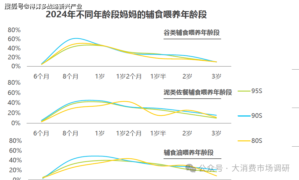 0/95后媽媽中,為1歲以內(nèi)寶寶選擇果泥、輔食油等新品類的比例顯著高于80后