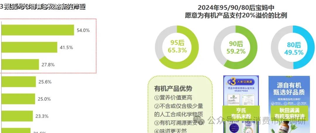 6個(gè)月-3歲嬰幼兒媽媽希望通過購買輔食給寶寶更全面的營養(yǎng),同時(shí)又擔(dān)心成品輔食中有不適合寶寶的添加成份、食材不新鮮等問題。有機(jī)輔食有更為嚴(yán)格的產(chǎn)品標(biāo)準(zhǔn),同時(shí)從生產(chǎn)開始保證不含或含極少量的人工合成化學(xué)物質(zhì),更符合無添加的概念。相比80后媽媽,年輕一代媽媽對(duì)有機(jī)產(chǎn)品的期待更高。