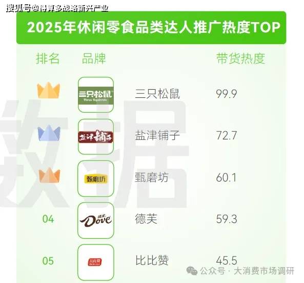休閑零食品類帶貨達(dá)人格局呈現(xiàn)差異化特征。從集中度看,CR100 達(dá) 23.9% ,遠(yuǎn)高于食品飲料的 17.19% ,顯示零食品類達(dá)人資源更向頭部集中。銷售分布上,達(dá)人推廣貢獻(xiàn)超七成,品牌自營占比 28.74% ,達(dá)人營銷成為零食銷售關(guān)鍵引擎。2025 年達(dá)人推廣熱度 TOP5 中,三只松鼠以 99.9 熱度領(lǐng)跑,鹽津鋪子、甄磨坊等緊隨,印證頭部品牌借達(dá)人流量破局,通過達(dá)人精準(zhǔn)觸達(dá)消費群體,放大品牌聲量與銷售轉(zhuǎn)化 。