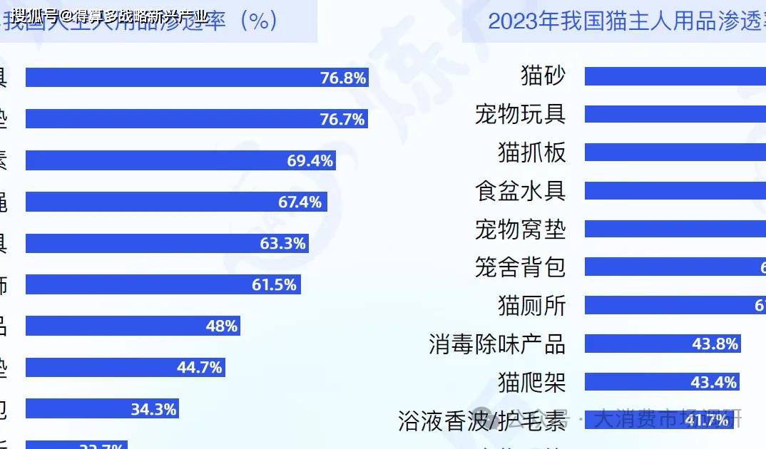 寵物玩具、清潔護理用品、窩墊、食盆水具滲透率超6成,寵物智能用品、家電滲透率還比較低,未來智能化升級將成為大的發(fā)展趨勢。根據(jù)《2023-2024年中國寵物行業(yè)白皮書》數(shù)據(jù)顯示,2023年我國犬類用品滲透率前三的品類為寵物玩具76.8%、寵物窩墊76.7%、浴液香波/護毛素69.4%,貓類用品滲透率前三的品類為貓砂91.6%、寵物玩具85.4%、貓抓板75.1%;寵物家電和智能用品的犬貓用品滲透率均低于20%。