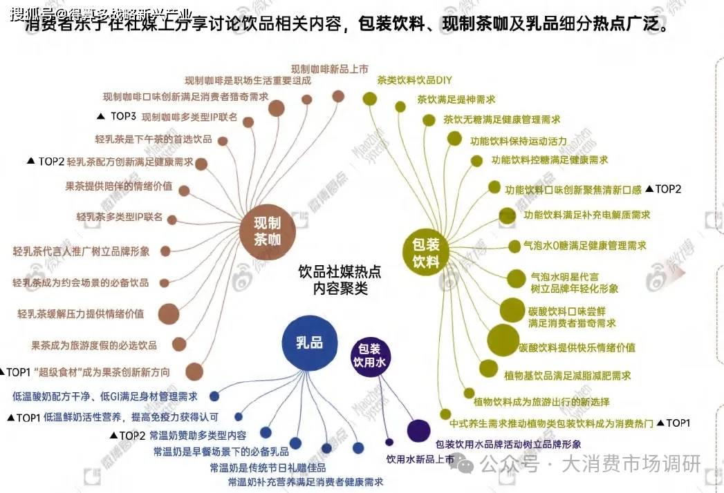 社交媒體上飲品熱議內(nèi)容呈現(xiàn)多樣化結(jié)構(gòu):[情緒]和[健康]需求帶動現(xiàn)制茶飲討論熱度;[IP聯(lián)名]及[味獵奇]引爆現(xiàn)制咖啡熱潮;「營養(yǎng)健康]需求驅(qū)動消費(fèi)者購買低溫鮮奶;「養(yǎng)生需求]及[口味創(chuàng)新]驅(qū)動包裝飲料持續(xù)煥新。