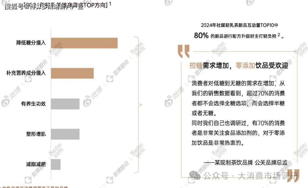現(xiàn)制茶飲中輕乳茶在[配方升級]層面上更加滿足消費(fèi)者對[健康需求]的追隨,其中[降低糖分?jǐn)z入]是消費(fèi)者討論熱度最高的需求方向。