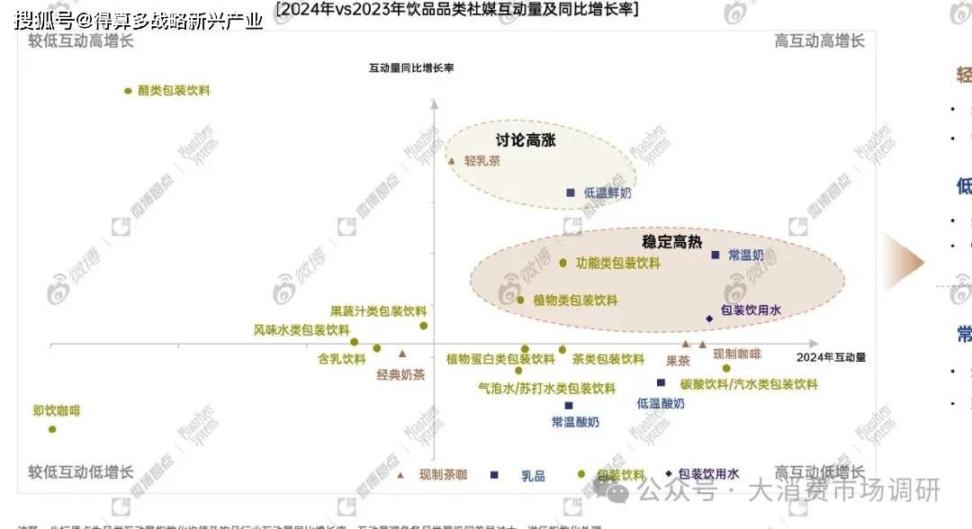 2024年,常溫奶]在社媒平臺討論中互動量穩(wěn)占高位,[輕乳茶]及[低溫鮮奶]相較2023年互動量增速顯著成為社媒熱門討論品類。