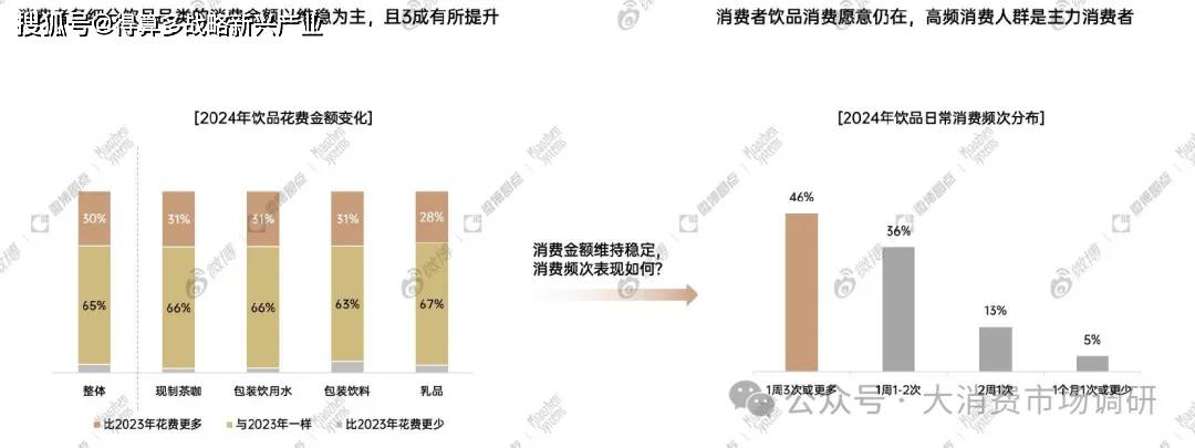 2024年超六成消費(fèi)者飲品消費(fèi)金額與2023年基本持平,「三成]的消費(fèi)者對飲品支出有所[增長];購買飲品成為絕大多數(shù)消費(fèi)者的日常行為,其中每周[消費(fèi)3次及以上]的人群占比最高。