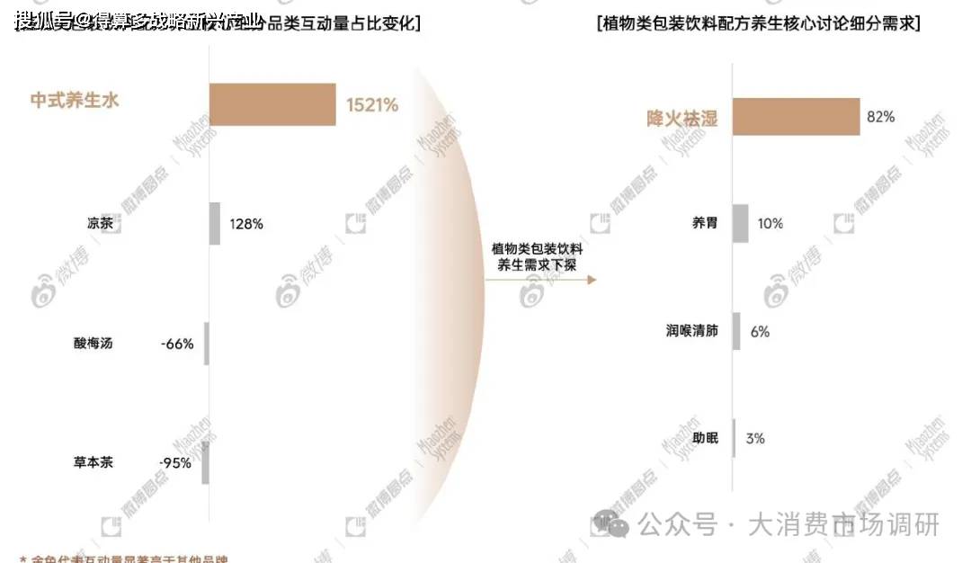 消費(fèi)者對于養(yǎng)生和健康的追求,驅(qū)使消費(fèi)者熱議[中式養(yǎng)生水]為代表的植物類包裝飲料其天然、健康的產(chǎn)品屬性滿足消費(fèi)者[降火祛濕 等養(yǎng)生需求,在社媒平臺形成高互動討論。