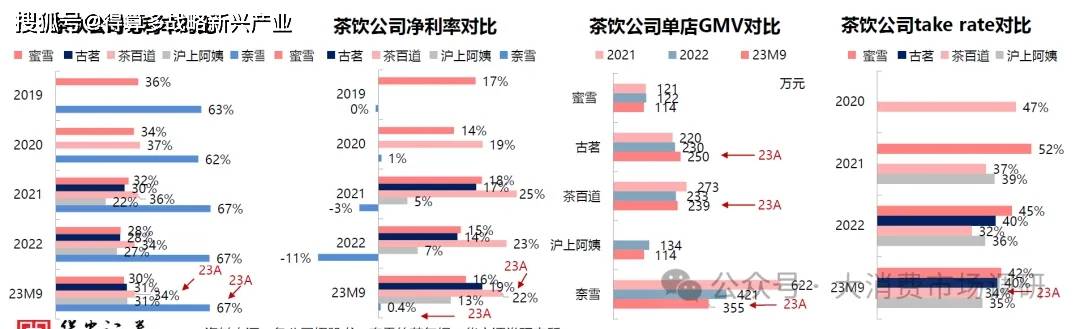 毛/凈利率:蜜雪冰城/古茗毛利率相當,差異在銷售投入影響凈利率;茶百道凈利率高于同業(yè),因毛利率偏高;滬上阿姨凈利率低于同業(yè),規(guī)模效應尚待加強;直營模式的奈雪毛利率較高但凈利率偏弱。單店GMV:蜜雪冰城/古茗健康,蜜雪門店加密下單店產(chǎn)出并未降低,古茗21-23年同店增速甚至連續(xù)增長12%/3%/9%Take rate:蜜雪冰城/古茗較高,體現(xiàn)其供應鏈價值;茶百道較低,或因原料定價且外賣占比更高(公司60%vs行業(yè)56%)