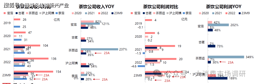收入YOY:蜜雪冰城/奈雪的茶起始收入相當,蜜雪擴張積極、古茗穩(wěn)扎穩(wěn)打、茶百道/滬上阿姨于21/23年爆發(fā)開店;奈雪的茶因直營模式增速相對偏弱;
