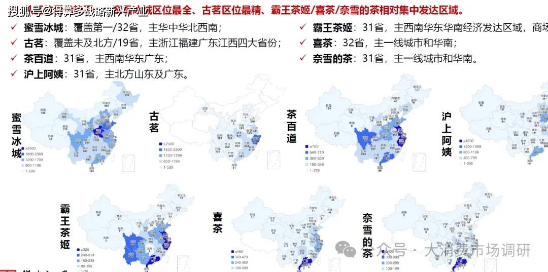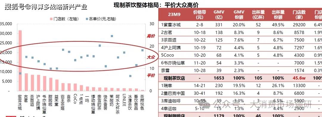 平價:蜜雪冰城獨占主導。定價2-8元的蜜雪冰城是平價市場的絕對主導,其GMV份額20%/量份額50%,幾乎無同等競爭對手,在現(xiàn)制飲品領域其GMV已超中國咖啡GMV第一的瑞幸、全球僅次于星巴克。大眾:充分競爭百家爭鳴。當前百億級別的古茗、茶百道、霸王茶姬占位領先,競爭已趨白熱化。當前高價品牌奈雪的茶、喜茶紛紛降價進入大眾市場(最低10元)并開放加盟,梯隊競爭日趨激烈。高價:底部崛起倒逼降級。