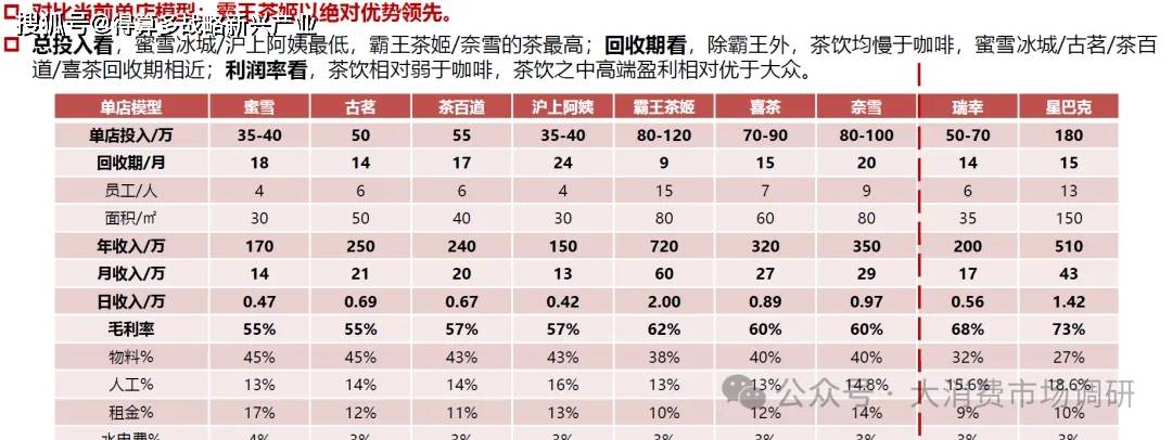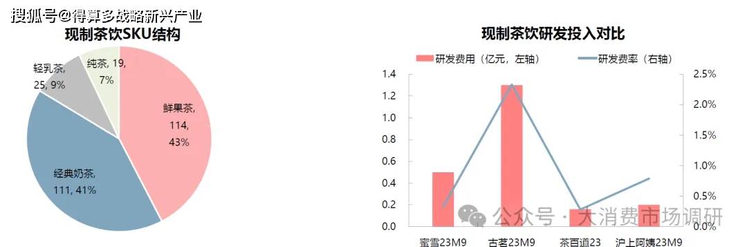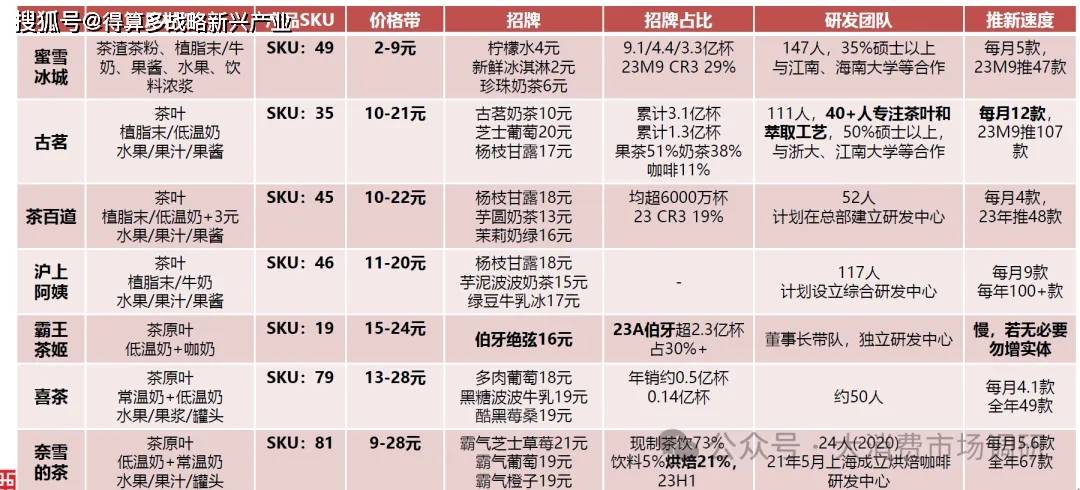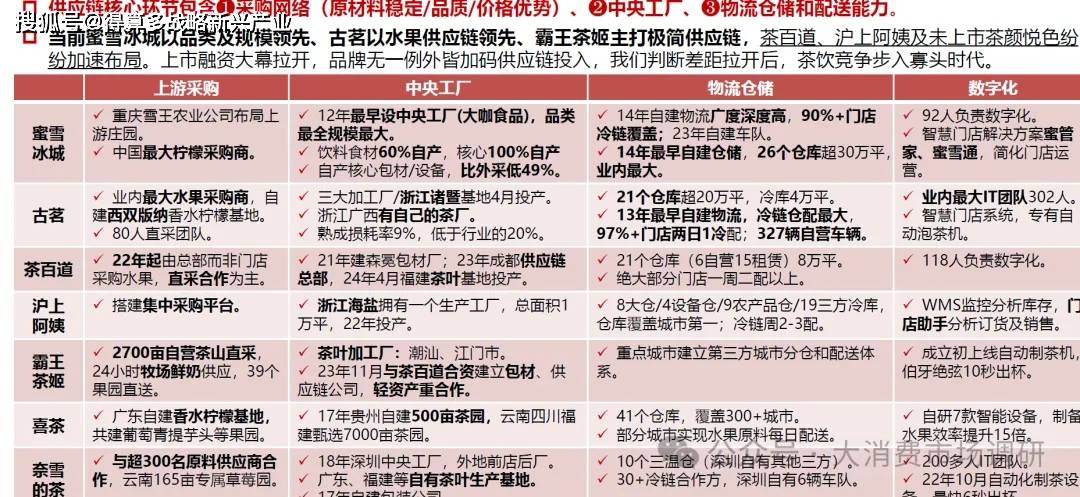 蜜雪冰城:薄利多銷不難喝是王道,茶渣茶沫+植脂末+果醬等原料,但儲運方便供應鏈相對簡單。古茗:主打水果茶,曾為喜茶平替,推新快,研發(fā)投入最高茶百道:主打水果茶,研發(fā)費率最低。滬上阿姨:主打水果茶,子品牌茶瀑布對標蜜雪