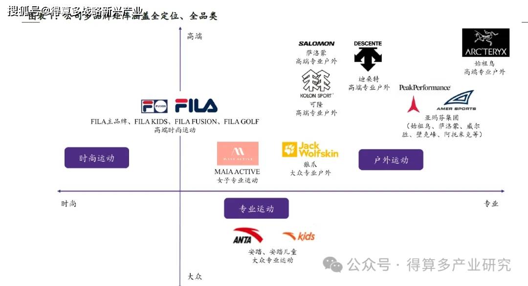 公司多品牌矩陣涵蓋全定位、全品類。安踏主品牌(安踏、安踏兒童)定位大眾專業(yè)運(yùn)動(dòng);斐樂(FILA、FILA KIDS、FILA FUSION)定位高端時(shí)尚運(yùn)動(dòng);迪桑特、始祖鳥等定位高端專業(yè)戶外;狼爪定位大眾專業(yè)戶外;可隆、薩洛蒙等定位高端休閑專業(yè)戶外;MAIA ACTIVE定位女子專業(yè)運(yùn)動(dòng)。產(chǎn)品條線覆蓋成人、兒童市場,涵蓋綜合訓(xùn)練、籃球、跑步、時(shí)尚健身、網(wǎng)球、高爾夫、滑雪、戶外、瑜伽等,品類齊全,能夠滿足多元人群多樣化的運(yùn)動(dòng)需求。