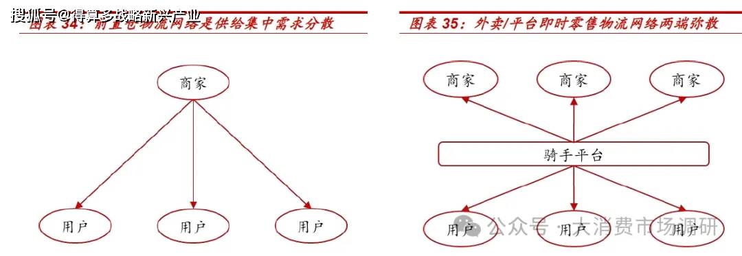 平臺即時零售與外賣可復(fù)用物流網(wǎng)絡(luò)。前置倉模式下,物流供給集中、需求彌散,騎手網(wǎng)絡(luò)結(jié)構(gòu)與外賣供需兩側(cè)均彌散分布的特征不同,因此二者獨(dú)立。而平臺型即時零售的網(wǎng)絡(luò)特征與外賣接近,二者可兼容。