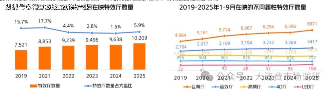 特效廳建設(shè)邁上新臺階,成為優(yōu)化觀影體驗的核心載體。前三季度全國在映特效廳數(shù)量突破一萬個,占影廳總數(shù)的12.5%,標(biāo)志著放映設(shè)施升級取得了實質(zhì)性進(jìn)展。具體來看,巨幕廳已接近6900個,音效廳超過3400個。此外,LED廳作為后起之秀,發(fā)展迅猛,預(yù)計明年將突破200個。這些高端影廳的普及從視聽效果到沉浸體驗全方位提升了放映質(zhì)量,成為吸引觀眾回流、推動市場持續(xù)復(fù)蘇的重要動力。
